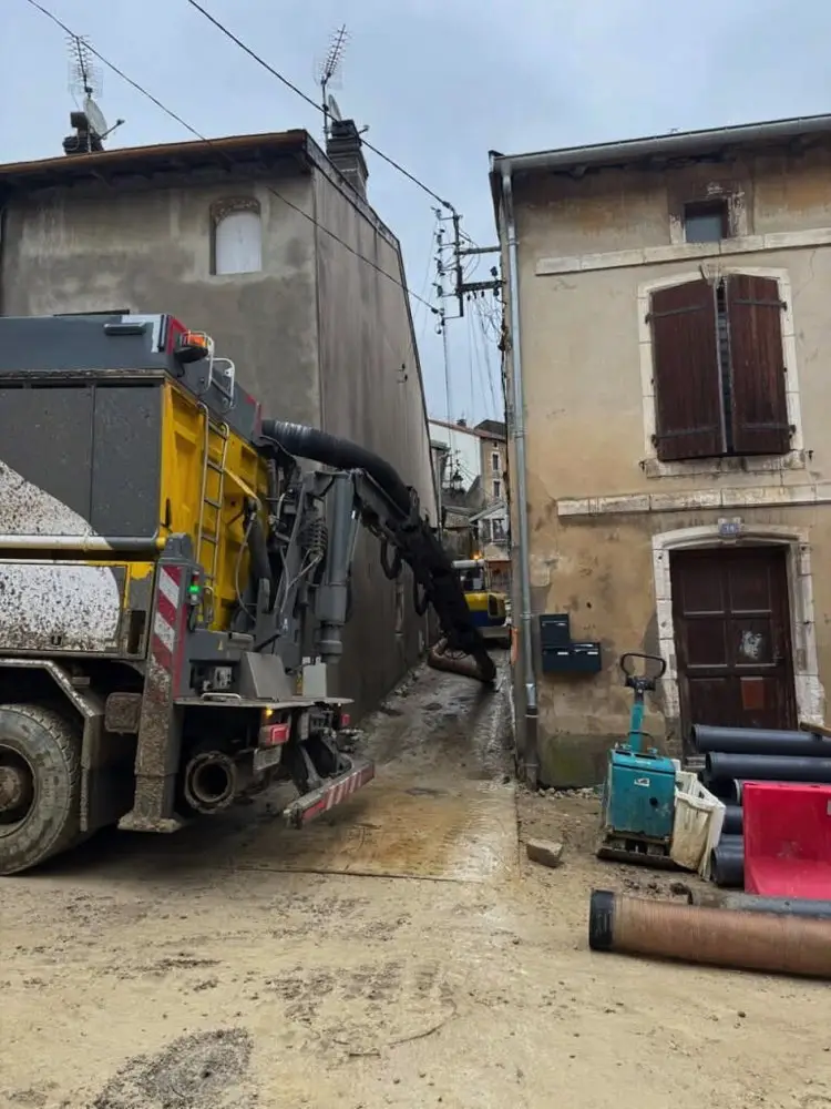L’originalité de cette intervention réside dans la parfaite coordination entre les engins. En bout de ligne, une pelleteuse effectuait le terrassement et alimentait directement le tuyau d’aspiration avec les déblais. Cette synergie entre le terrassement mécanique et l’aspiration par dépression permet une évacuation continue à Foug, sans passage de brouettes ou de bennes, optimisant ainsi considérablement le temps d’exécution.